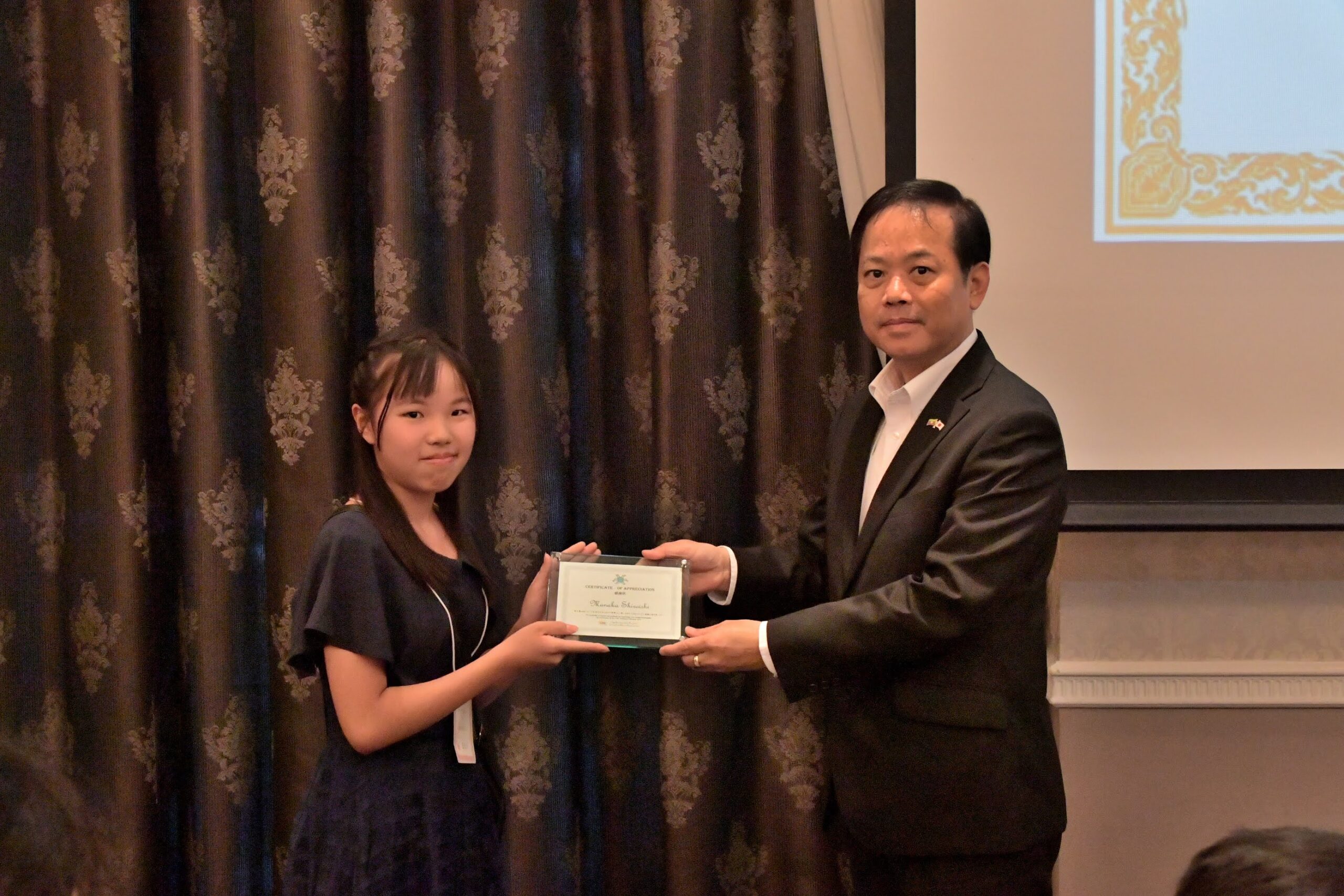 前半はCMCの昨年度の活動報告や、提言集vol.8と掲載された児童の皆さんの紹介、そしてとくに素晴らしい意見を書いた子どもたちに対し列席した駐日大使みずから子どもたちに表彰の記念品を手渡ししました。